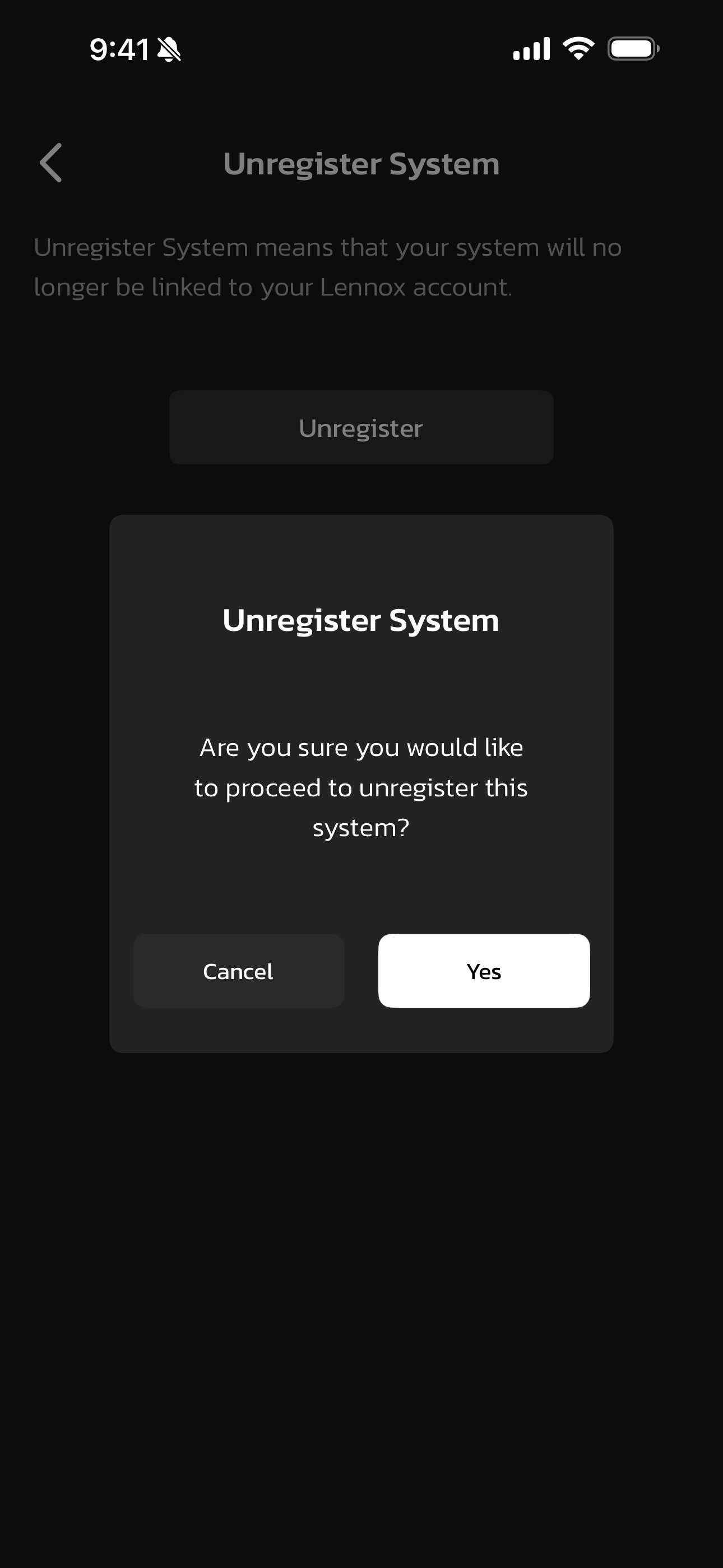 If you have moved into a home with an S40 that is still registered to the previous owner's account, you may re-register this thermostat after unregistering it first. To unregister, go to Menu > Settings > (Advanced Settings) Unregister System > Unregister and select Yes. Now you will be able to re-register the device to your account.